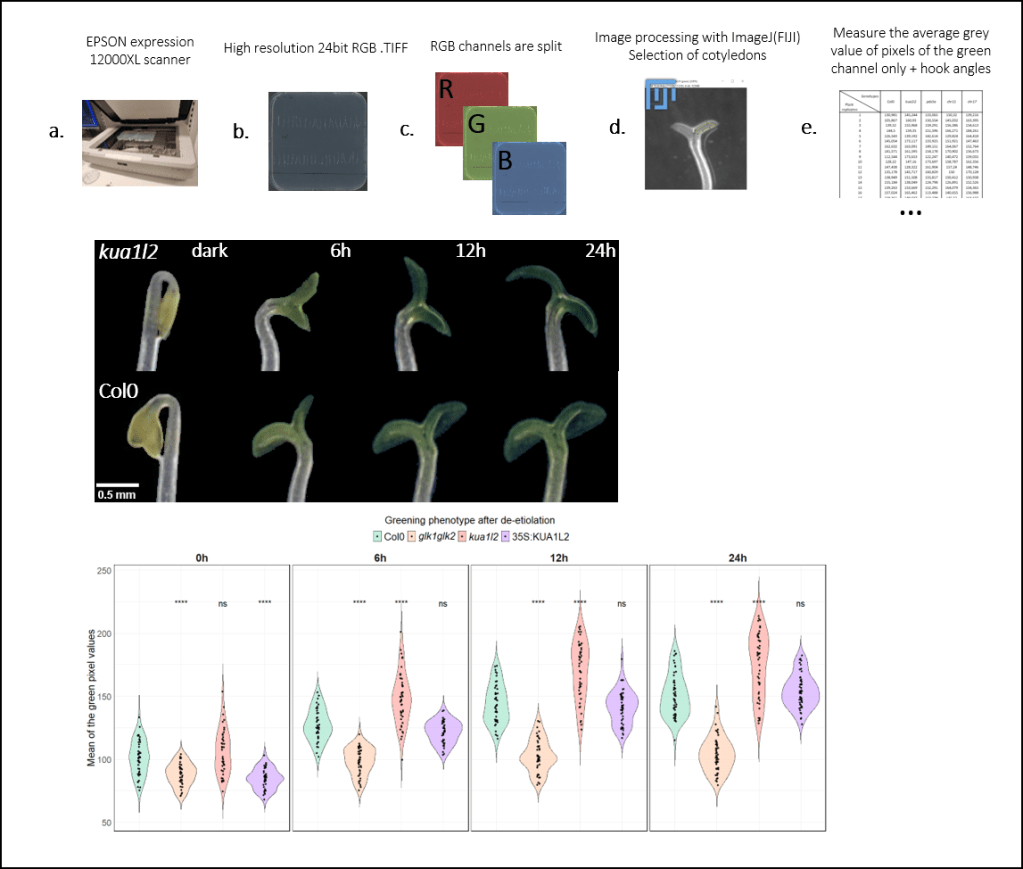 When I arrived in UPSC, my group were phenotyping early greening phenotype of plant using cameras in the greenhouse. It was nearly impossible to reproduce light conditions and resolution over time, leading to losing time and making color comparison untrustable. In my project, I had to screen dozens of mutants for ealy greening phenotype, I had to find a way to make it fast, high throughput, cheap, and reproducible to be useful for everyone. I designed a process using simple scanners coupled with ImageJ picture treatment software to perform this fast screen. With this fast method I could upscale the number of mutants and individuals and could show significant and repetable results. My group benefited from this new method and collaborators started to implement it in their own process (e.g. measure anthocyanin levels).
