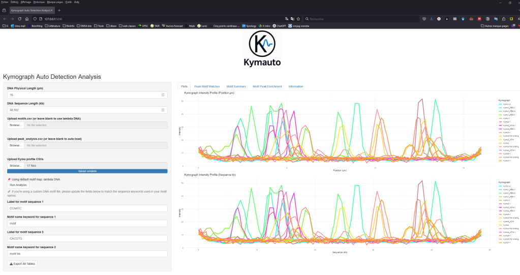 In my current group, we perform single-molecule interaction using the C-Trap optical tweezers technology from Lumicks. We are interested in the protein/DNA interaction. The company can supply us with special DNA handles that are labelled and are used to position precisely DNA regions along the optical tweezers. They act like beacons for us to know where interaction happens. Lumicks also provides an analysis basic software. Unfortunately, those handles are costly, very costly and not provided for many reactions and the basic analysis from the software isn’t enough for our needs. To bypass these two limiting costs we tried to work with lambda DNA, cheaper, without labelling but the positioning of interactions were difficult and not precise. I decided to create a tool using the kymographs from the C-Trap to position peaks intensity over a map of the lambda DNA (or other custom DNA maps) based on specific motifs (or custom motifs). This freed us from using Lumicks’ handles and we can analyse the interaction-peak positioning without paying for an upgraded license. Kymauto is a pipeline using ImageJ and R shiny apps (need to be pre-installed on your device), it is user-friendly : users don’t need any programming knowledge. It runs the interface with your own favorite web browser. It can analyse peak positioning, analyse your motifs specificity and statistical motif/peaks enrichment to extract any biological meaning from our experiment. Kymauto makes us save money, time, and release us from the help of a busy bioinformatician.